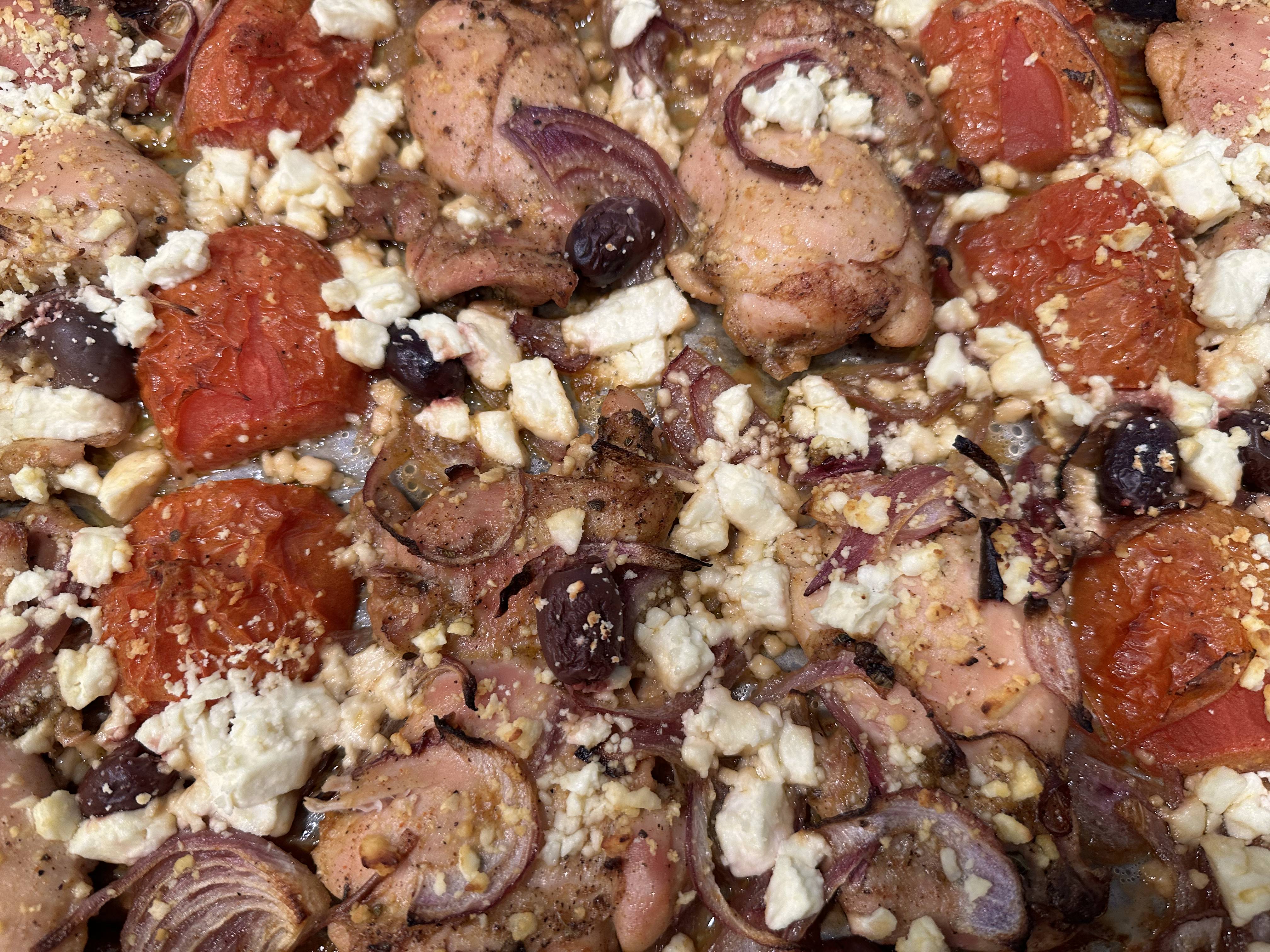 - Remove the baking sheet from the oven, and add the Kalamata olives and crumbled feta cheese. Return it to the oven for an additional 10 to 15 minutes, or until the vegetables are tender and chicken is cooked.