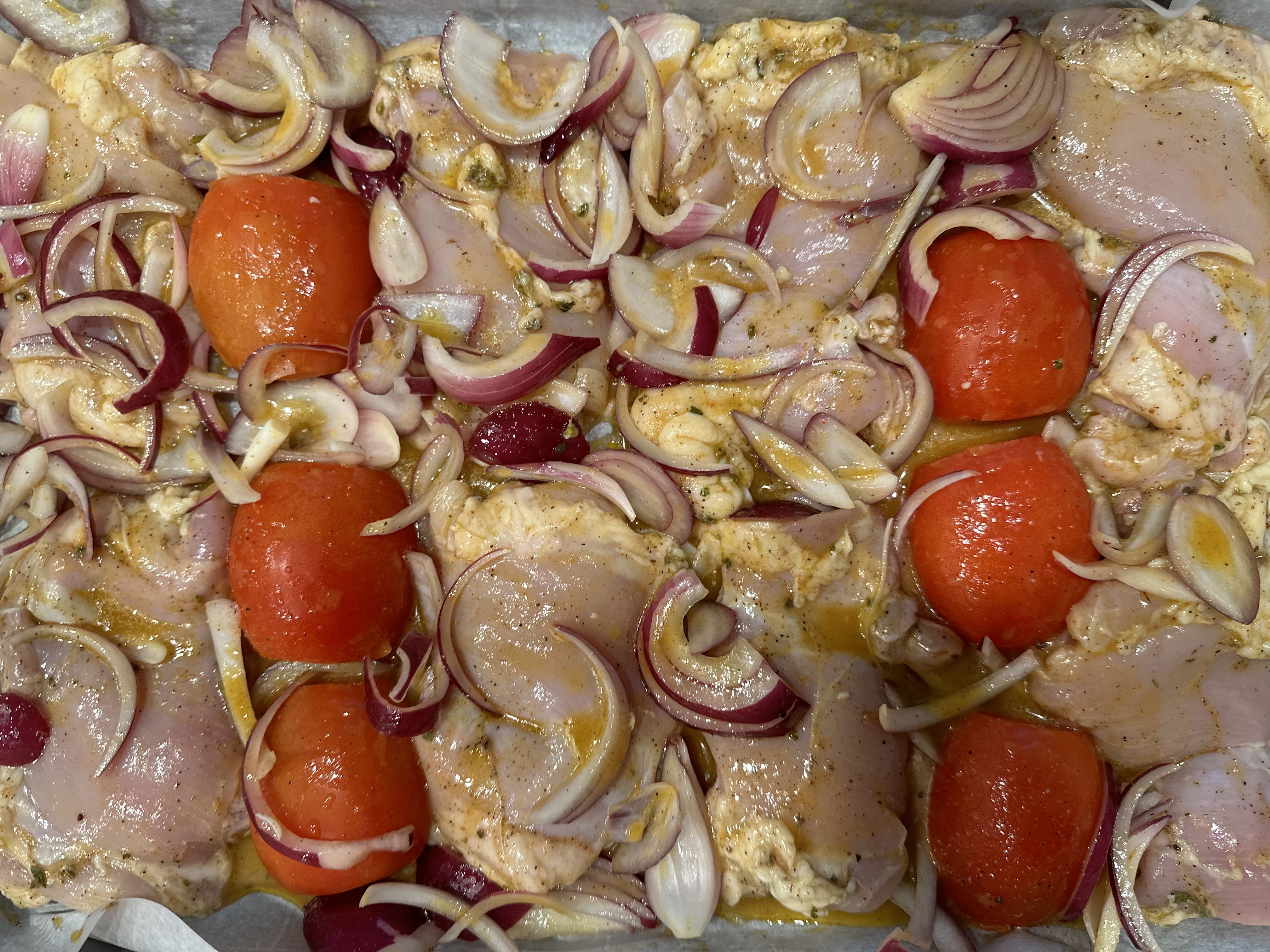 - Pour the remaining marinade over the chicken, onions, and tomatoes.